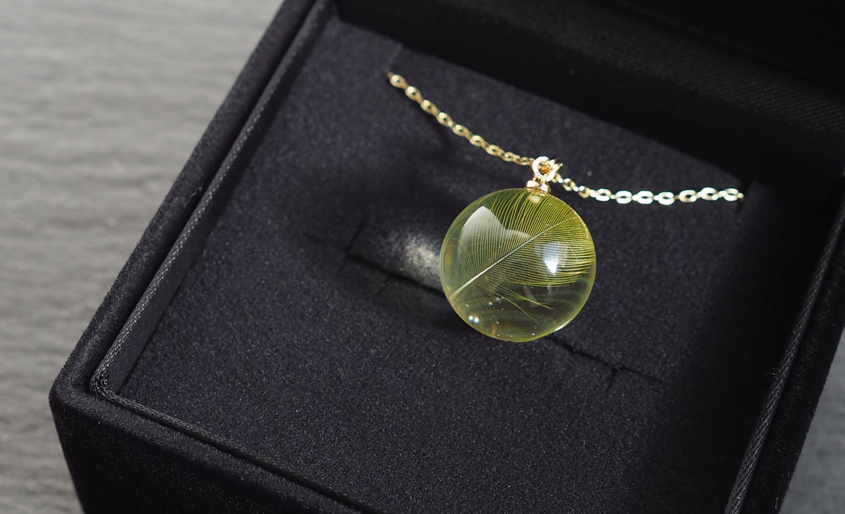 大切な鳥さんの羽根をレジンに封入した球体ネックレスの制作事例をご紹介します。